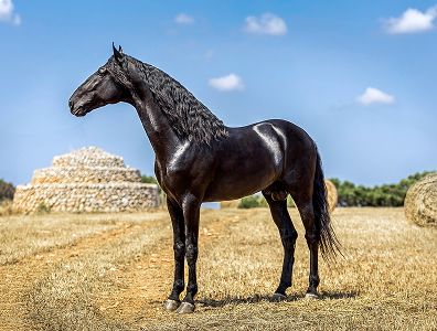 Se caracteriza por su capa negra uniforme, alzada media-alta, figura esbelta y cuello arqueado, que le confieren un porte altivo y elegante.